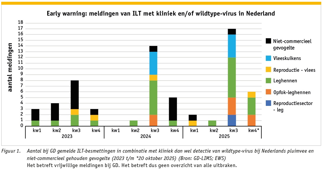 Zo maakte Royal GD afgelopen dinsdag 4 november bekend. Vanaf het derde kwartaal zijn meerdere uitbraken met ILT-wildtype vastgesteld, met name in de Gelderse Vallei (postcodegebieden 37, 38 en 67), hetgeen opnieuw benadrukt dat wildtypevirus aanwezig is in de omgeving en een blijvend risico is voor commercieel pluimvee, aldus Royal GD. In de onderstaande figuur staan alle 26 EWS-meldingen (early warning system) van Royal GD.