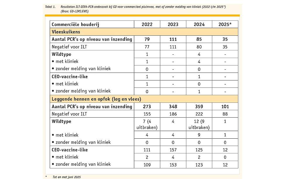 Bovendien is bekend dat het CEO-vaccin kan spreiden (binnen het gevaccineerde koppel en naar niet-gevaccineerde koppels), kan toenemen in virulentie en in het verleden tot uitbraakepisodes van ILT heeft geleid. Om de kans hierop te verkleinen heeft de sector zich sinds 2024 ingespannen om minder vaak CEO-vaccin te gebruiken. Deze inspanningen zijn terug te zien in de langetermijnresultaten van de monitoring op ILT (zie tabel 1), waarbij er in 2025 beduidend minder detecties van vaccine-like ILT zijn bij leggende hennen.