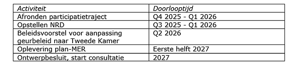 Daardoor kan de vereiste plan-milieueffectrapportage (MER) pas in de loop van 2026 worden opgesteld. De plan-MER zal de milieu-impact van verschillende beleidsopties in kaart brengen. ‘Na afronding van de plan-mer zal gestart worden met het opstellen van de wijzigingsregelgeving. Het streven is om deze in 2027 in consultatie te brengen’, schrijft Aartsen, die met nieuw beleid moet komen vanwege een rechtelijke uitspraak en aangenomen moties in de Tweede Kamer.