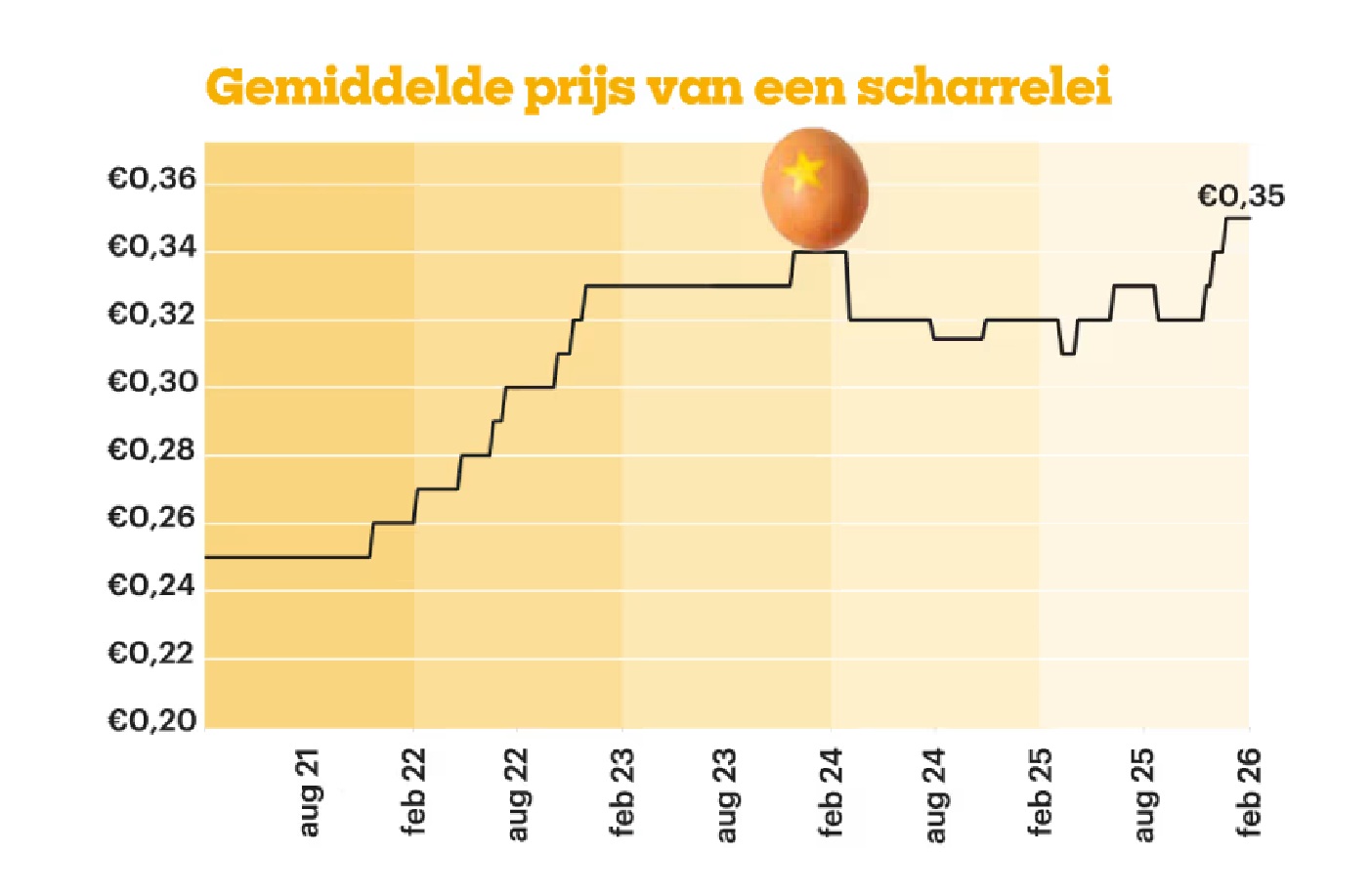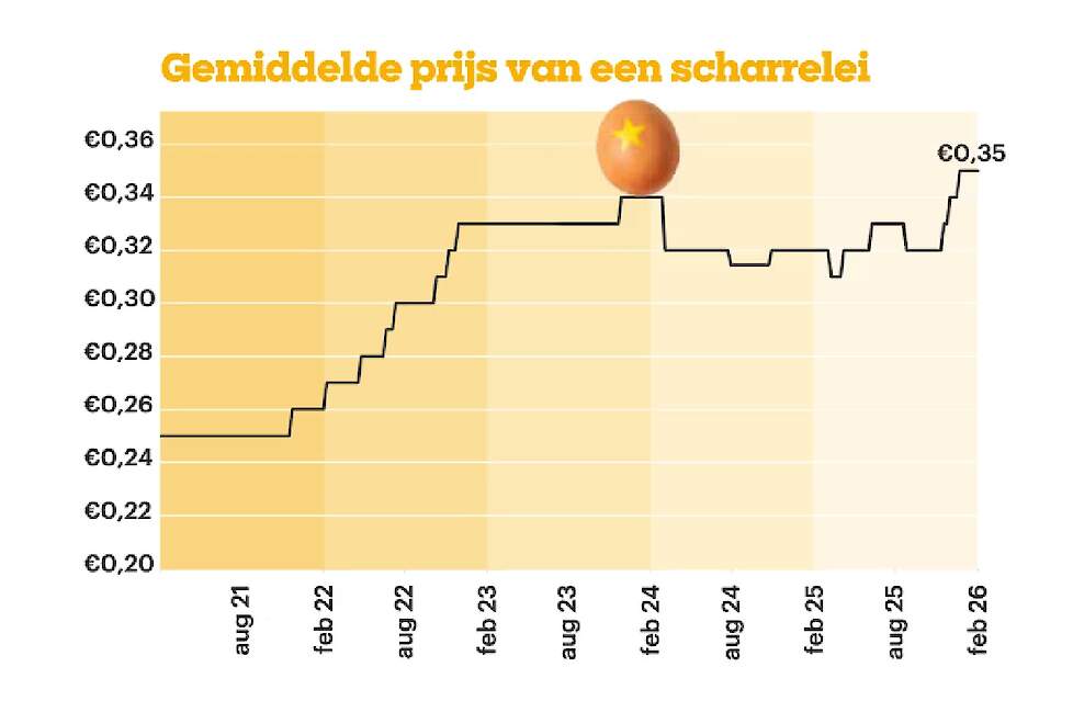 De prijs van scharreleieren steeg met 40 procent ten opzichte van 2021. De gemiddelde prijs was in februari 0,35 euro per scharrelei.