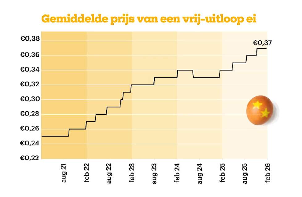 Eieren zijn fors duurder geworden voor de consument. Na een korte daling in 2024 zijn eieren opnieuw duurder geworden in de supermarkt. Een consument betaalde in februari 2026 gemiddeld 0,39 euro per ei. Dat is een stijging van maar liefst 38 procent in vijf jaar. De prijsontwikkeling verschilt sterk per soort ei. Biologische eieren stegen afgelopen jaren met 26 procent het minst hard. De prijzen van vrije-uitloopeieren stegen met 48 procent het hardst.