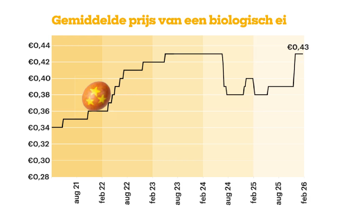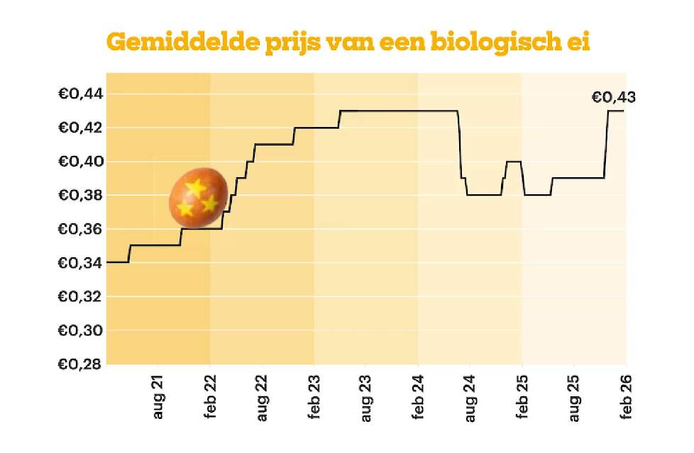 Biologische eieren stegen met 26 procent. De gemiddelde prijs bedroeg in februari 0,43 euro per ei.