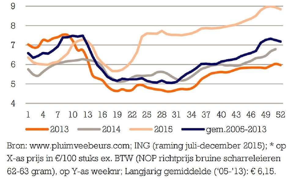ING zegt dat de prijsvorming van scharreleieren dit patroon volgt. Als dit niveau niet ineenzakt en verder de jaarlijkse trendlijn normaal verloopt, komen de gemiddelde prijzen dit jaar 25 procent hoger uit dan in 2014.