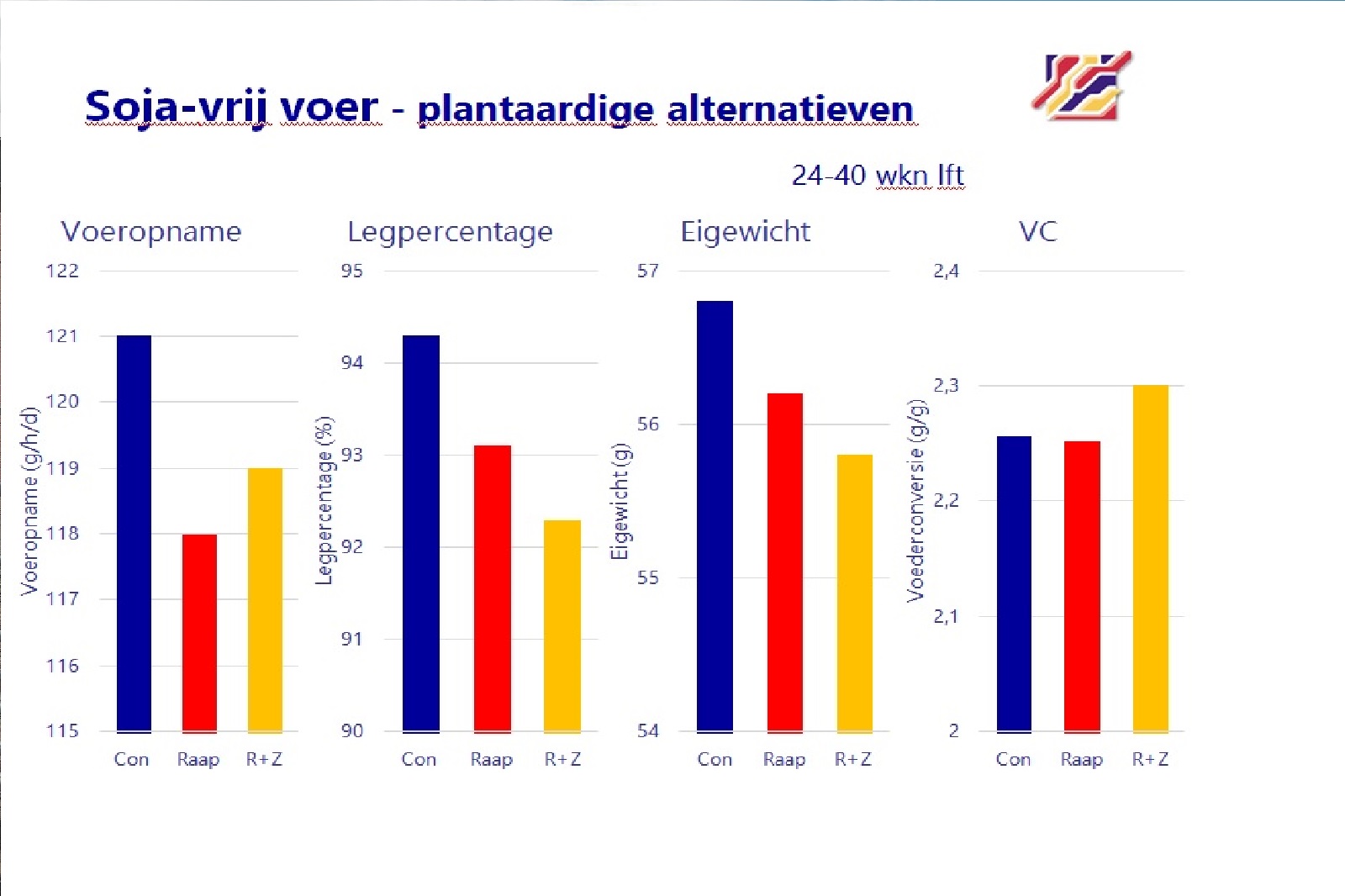 Ook het eigewicht was met 56,3 (raap) en 55,8 (raap en zonnebloem) veel lager dan in de controlegroep 56,8. De voederconversie van raap was met 2,25 iets lager dan de controlegroep 2,26. Die van raap en zonnebloem lag op 2,30. Na 40 weken waren de resultaten nog slechter dan in de controlegroep. (zie afbeelding)