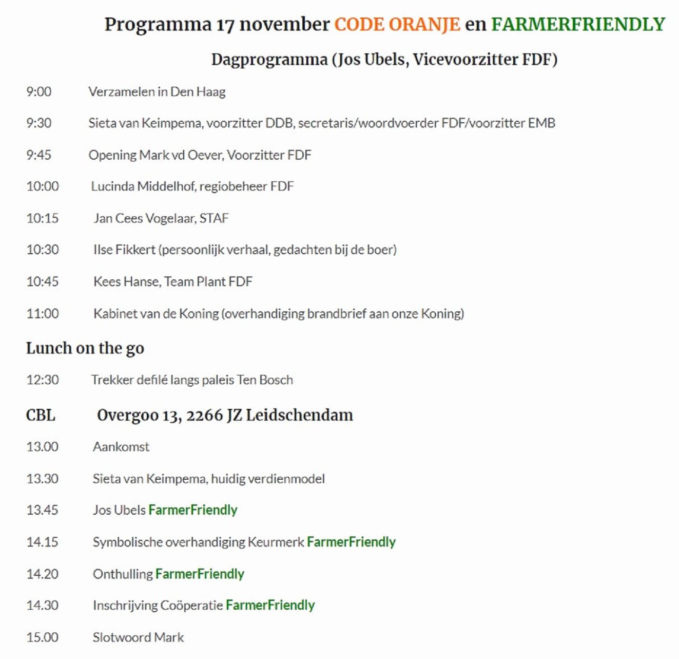 Volgens het programma komen er daarvoor ook sprekers. Zo staat Jan Cees Vogelaar namens STAF als een van de sprekers op de lijst. Het programma in de middag is in Leidschendam bij het CBL voor de lancering van FarmerFriendly.