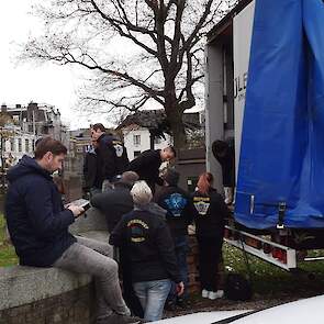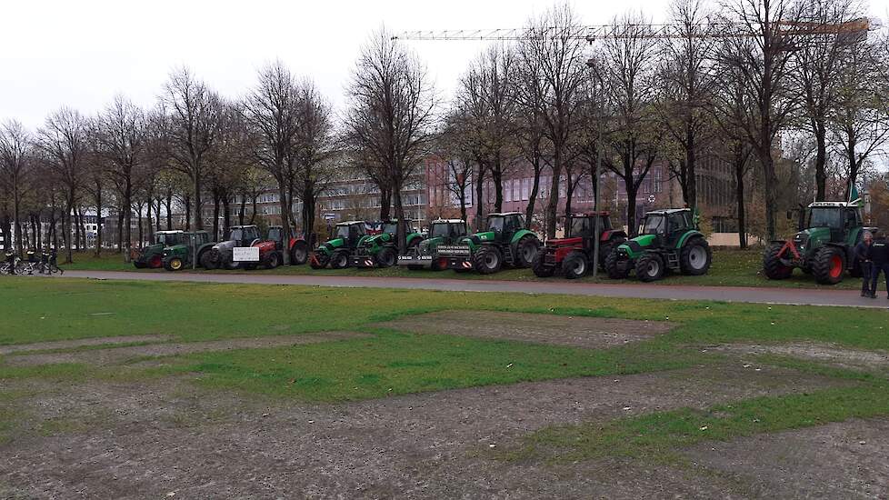 De reis van de Achterhoek naar Den Haag heeft zeven uur geduurd. Naar schatting staan er tot dusver 1.000 tot 1.500 trekkers in de straat. Eén weghelft van die straat is nog open voor verkeer, de andere dient als parkeergelegenheid voor de boeren. Het groepje waarmeer onze verslaggever aankwam, bestond nog maar uit drie trekkers. „De colonne was helemaal uit elkaar geslagen. Maar in de straat staan veel boeren, waaruit blijkt dat alles toch nog wel redelijk dicht bij elkaar zat.”