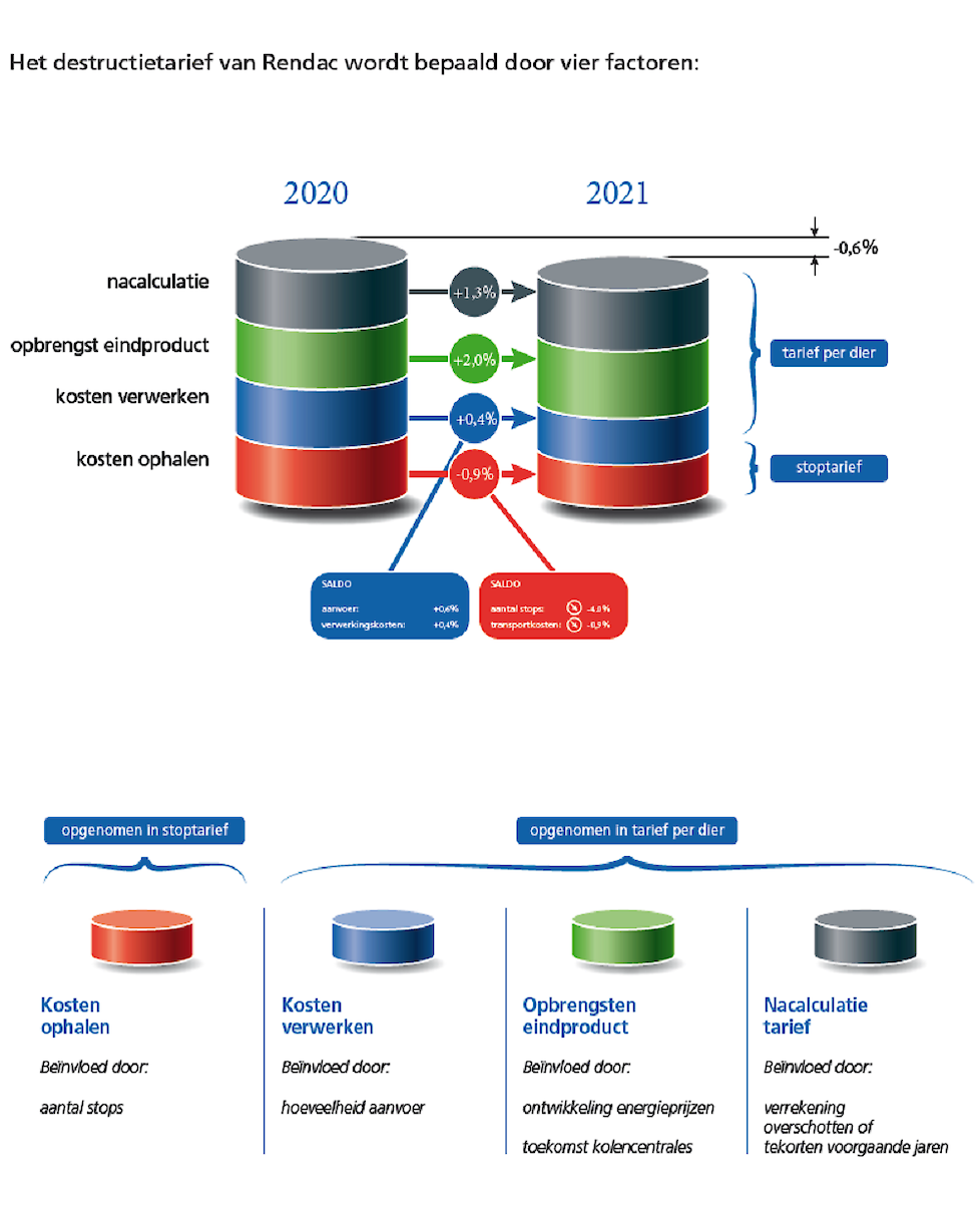 De tarieven per stop hebben betrekking op de kosten die gemoeid zijn met het ophalen van de kadavers. Rendac heeft becijferd dat de transportkosten in 2021 met 0,9 procent dalen. Daar staat echter tegenover dat het aantal verwachte stops, mede door schaalvergroting en een afname van het aantal veehouderijen, met 4 procent daalt. Dit heeft tot gevolg dat de kosten per stop alsnog met 3 procent stijgen. De kosten voor een reguliere stop komen in 2021 uit op 23.37 euro en de kosten voor een geplande stop stijgen naar 19,26 euro. In 2020 golden voor deze stops respectievelijk tarieven van 22,63 en 18,52 euro.