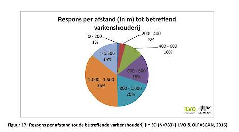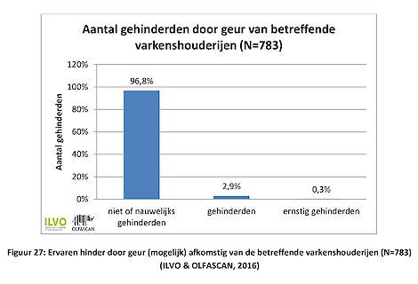 De resultaten van het ILVO- onderzoek laat in figuur 19 de algemene tevredenheid van bewoners in de naaste omgeving van de varkenshouderij zien. Figuur 27 uit het onderzoek betreffende percentages van gehinderde en ernstig gehinderde, samen 3,2 procent van de 783 nquêtes, spreken voor zich. Opmerkelijk is verder dat deze 3,2 procent, die vond dat dat ze hinder ondervonden, op een redelijke afstand van de varkensbedrijven gesitueerd waren. Op deze cijfers zouden vliegvelden en industriële bedrijven jaloers op zijn.