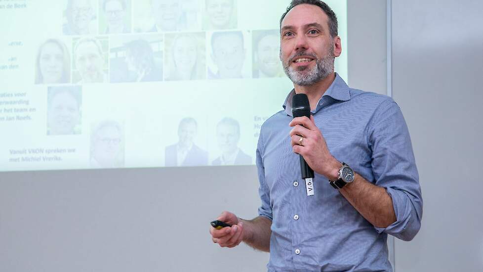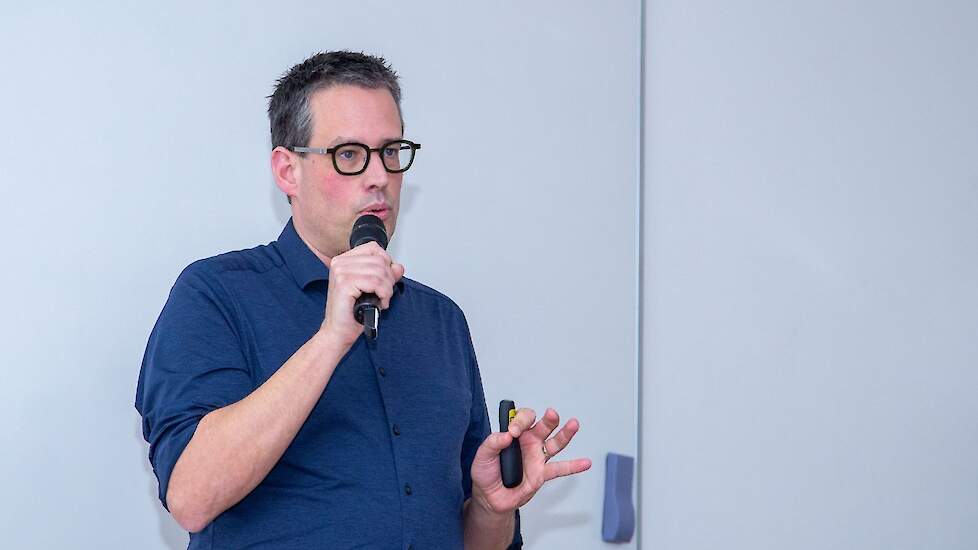 Xander Pieterse, Taskforce toekomstbestendige stallen, gaat in op het uitzetten van nieuwe ideeën om emissies te reduceren en wat het belang van samenwerken hierbij is. Beeld: Susan Rexwinkel