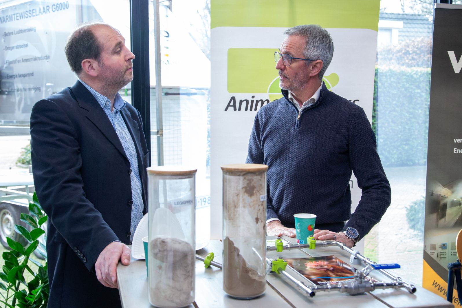 Jan Workamp, Praktijkcentrum Emissiereductie Veehouderij, gaat in gesprek over de pilots binnen emissiereductie en hoe deze tot meerwaarde zijn voor de veehouders. Beeld: Susan Rexwinkel